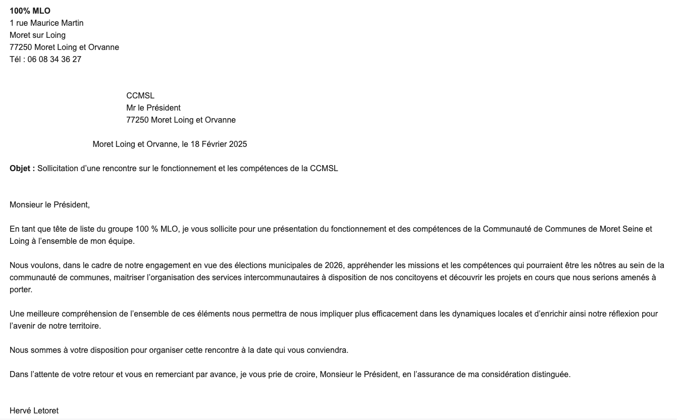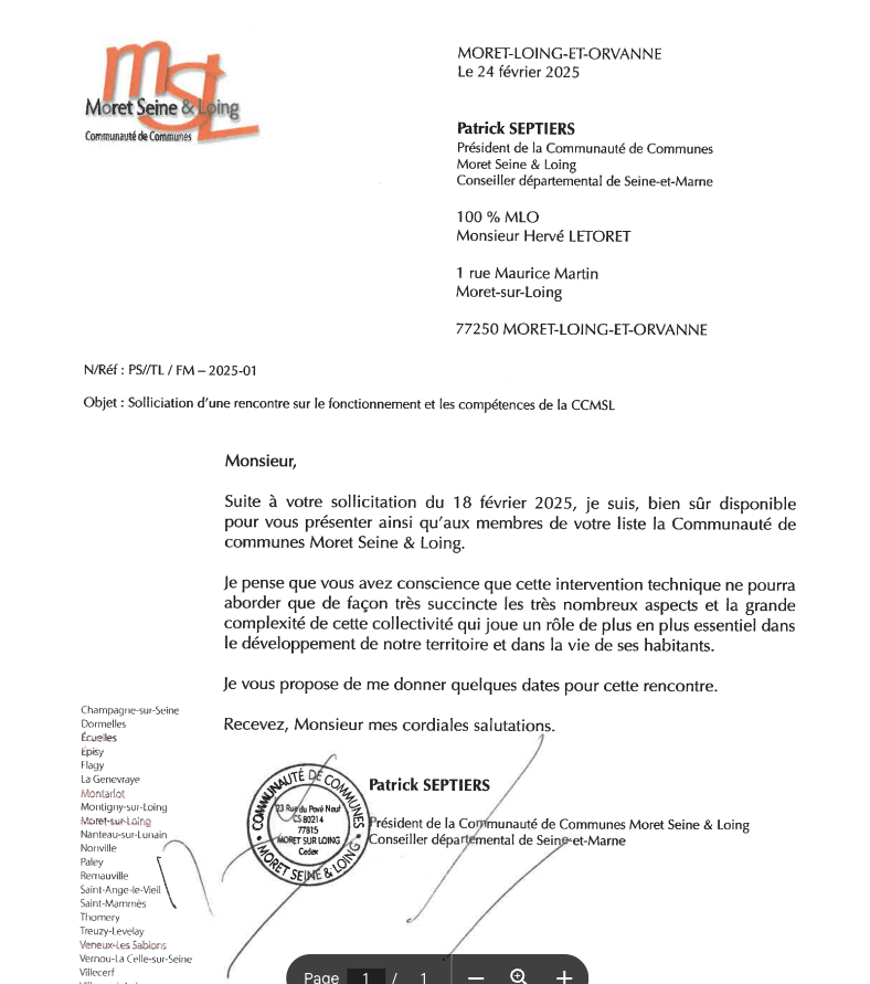 Dans un courrier adressé à Patrick Septiers, Hervé Letoret reconnaît lui-même avoir besoin d’explications sur le fonctionnement de Moret Seine et Loing, et demande qu’on lui précise le rôle de cette structure ainsi que celui de ses élus.Cette démarche pose une question simple :